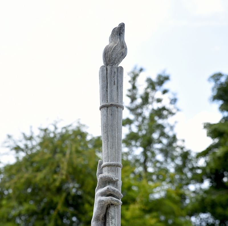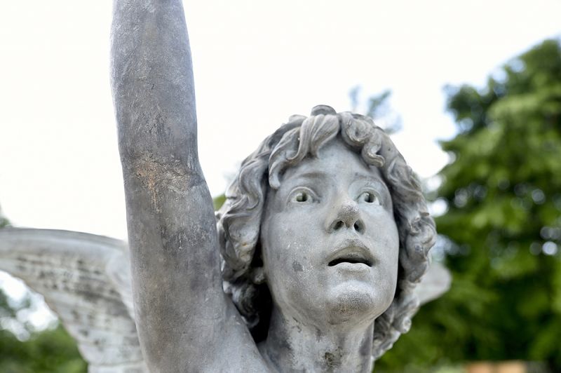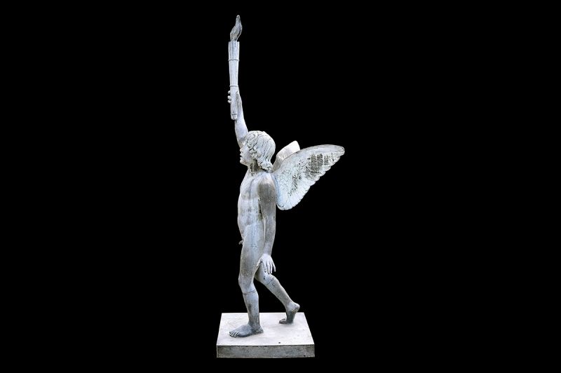 An eight foot dynamic zinc statue of Eros in motion. Holding a torch on a square pedestal base, circa 1910. Imported from America.