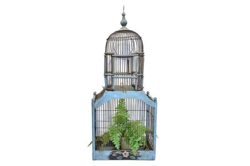 Pretty domed roof bird cage with painted detailing around the base. Circa 1920s.