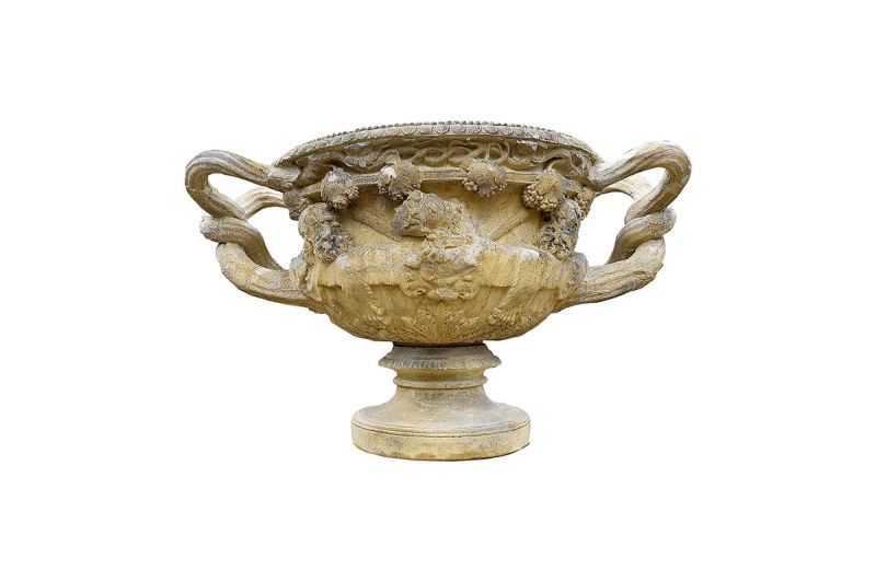 A replica of the ancient Roman vase discovered at Hadrian's Villa, Tivola, in 1771. The body is modelled with classical heads in high relief and the handles to either side are beautifully intertwined.