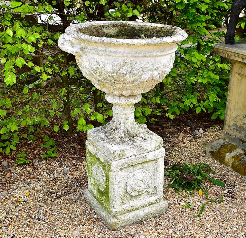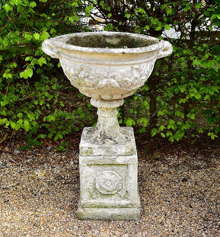 This pretty urn sits on a square plinth decorated with a laurel wreath on each side. It has a patterned rim, two handles and a heavily decorative body. Made from composition stone it has been painted white at some point of it's life.