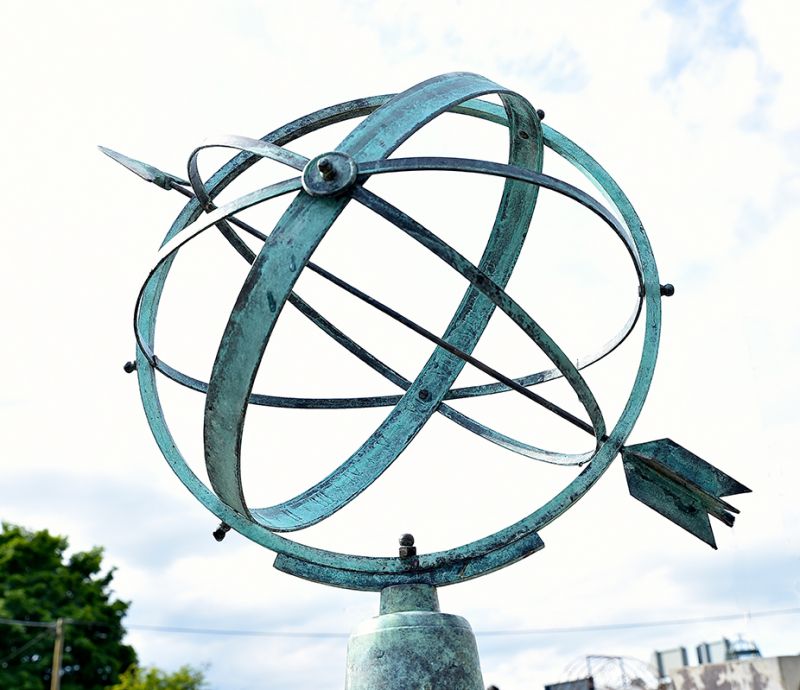 A bronze armillary sundial on a classical Georgian style pedestal, an excellent copy of an 18th century example, made from composition Bath stone. In stock.