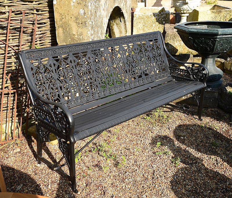 Cast iron bench in the style of a Coalbrookdale. Medieval pattern. Presented in black.