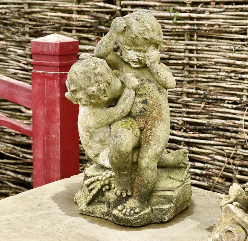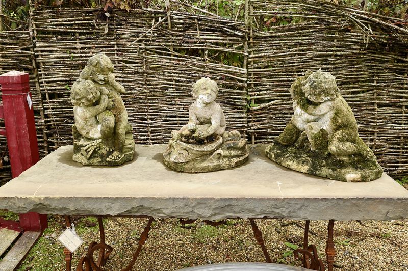 A set of early 20th century wrestling cherubs. Cast from composition stone. Heights 47cm - 60cm Width 33cm - 66cm Depth 40cm - 54cm