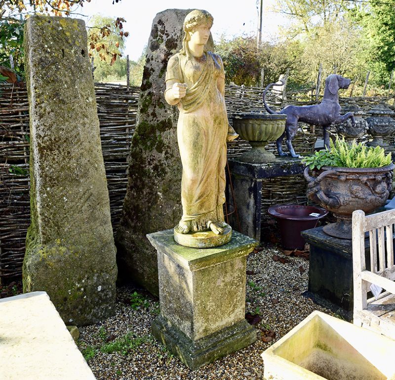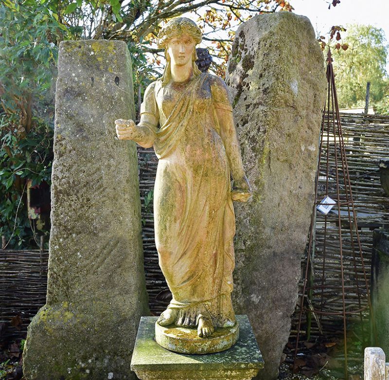 A 19th century figure on a beautifully aged later stone pedestal. An English terracotta statue by James Pulham with superb detailing.