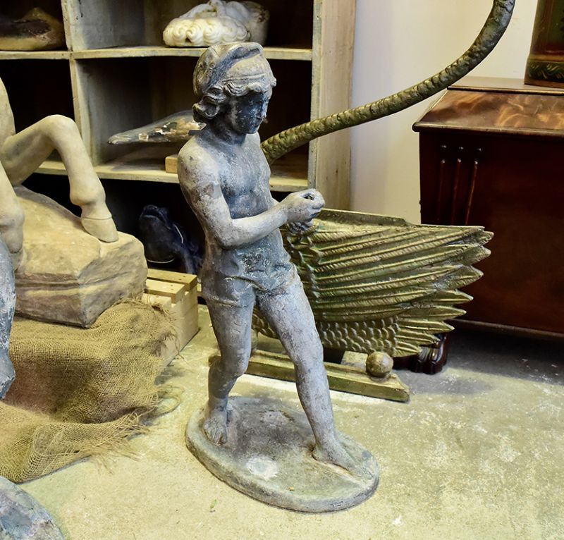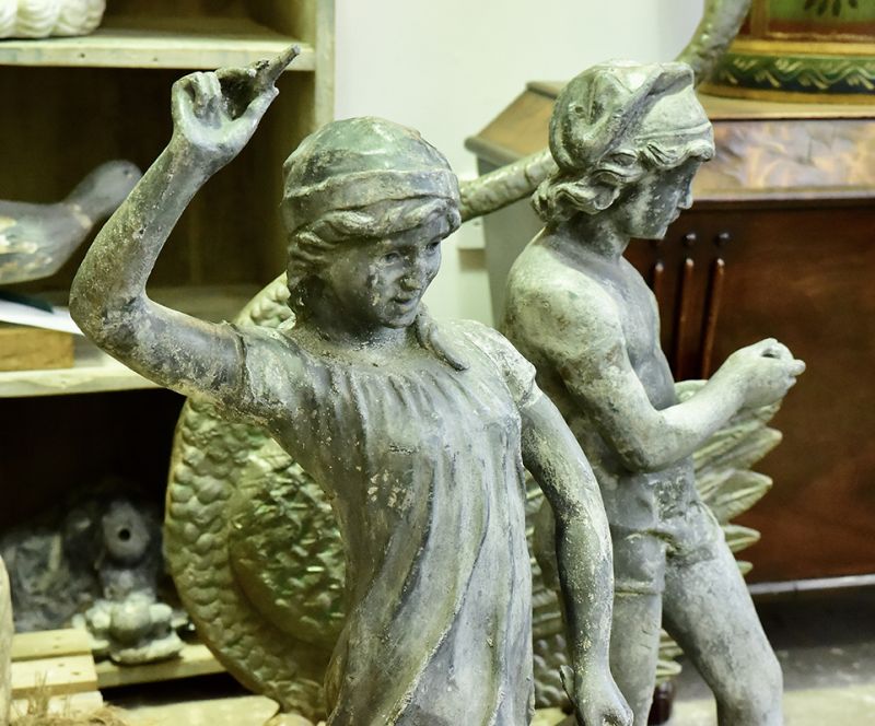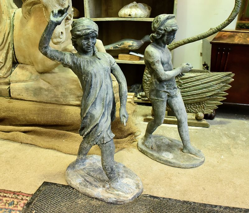 Charming pair of Neapolitan lead figures of a boy and a girl fishing. Great detailing, wearing tasselled caps. 19th century.