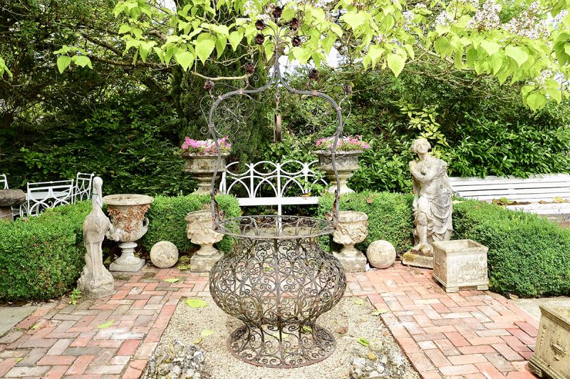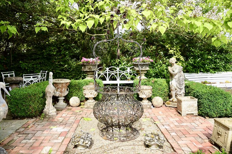 A fine and highly decorative late 19th/early 20th century balustrade design wellhead, blacksmith made with pretty rosette adornments together with original pulley wheel.