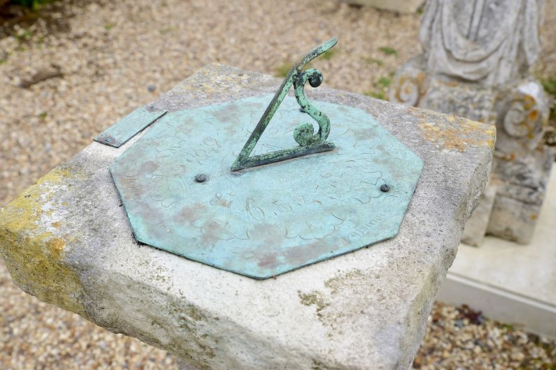 Octagonal bronze sundial plate with a scroll gnomon on a beautifully carved stone base. The sundial was a gift dated 1930.