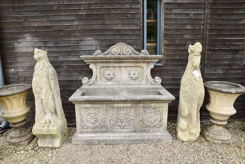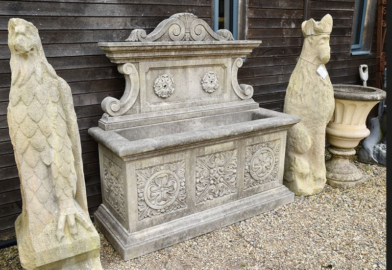 Ornate carved wall fountain with terrific scrolls and a highly patterned front panel. There are two rosette water spouts.