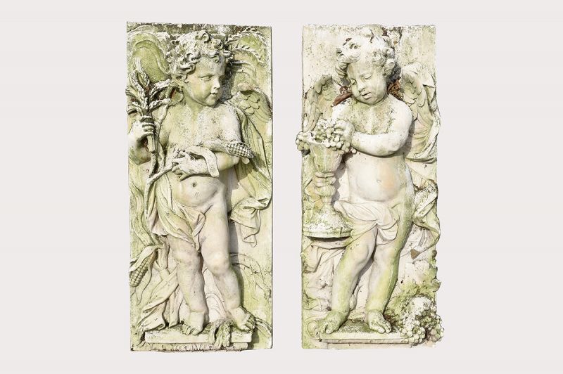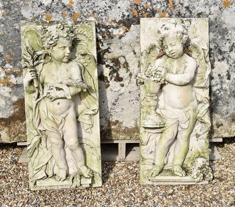 Two composition stone cherub friezes with highly decorative detailing that make a lovely pair. Not old but already hold attractive colouring.
