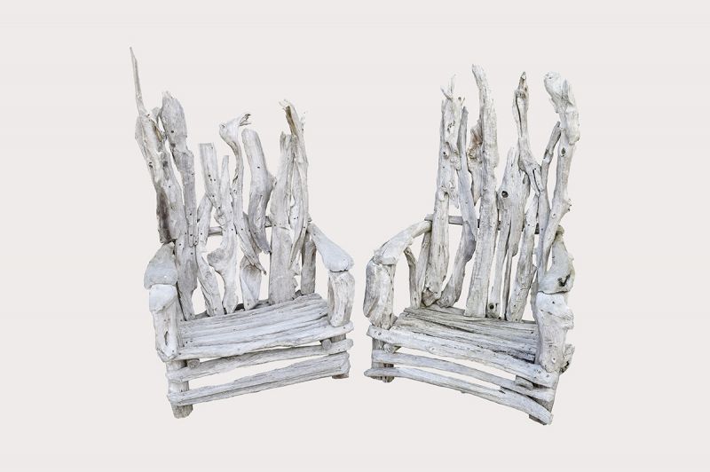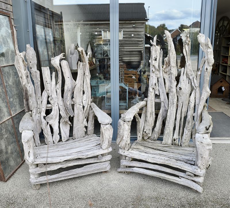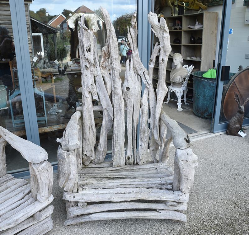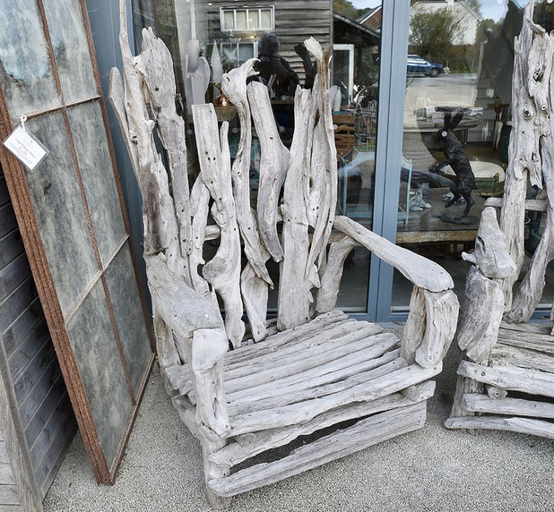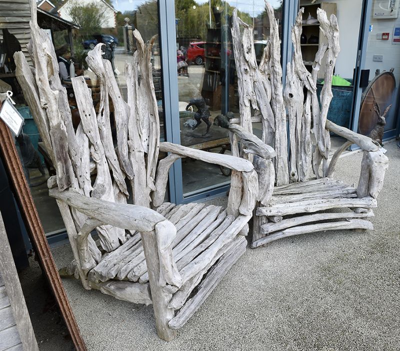We have a large pair of driftwood garden seats. Throne-like in their design! Priced individually, but they would look smashing as a pair.