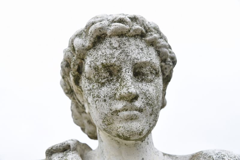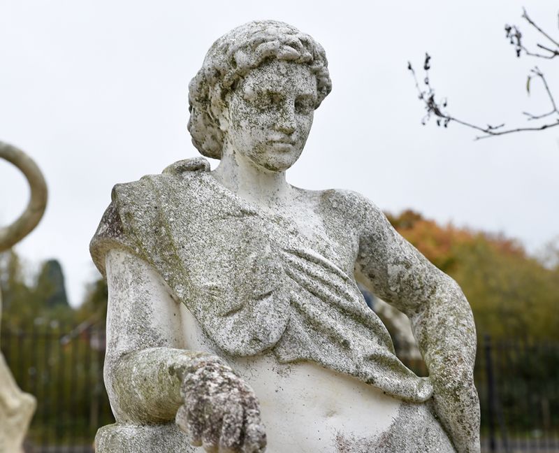 A 20th century composition marble statue of Pan. Nicely weathered statue and base which is decorated on front and back with a circular trumpet horn.