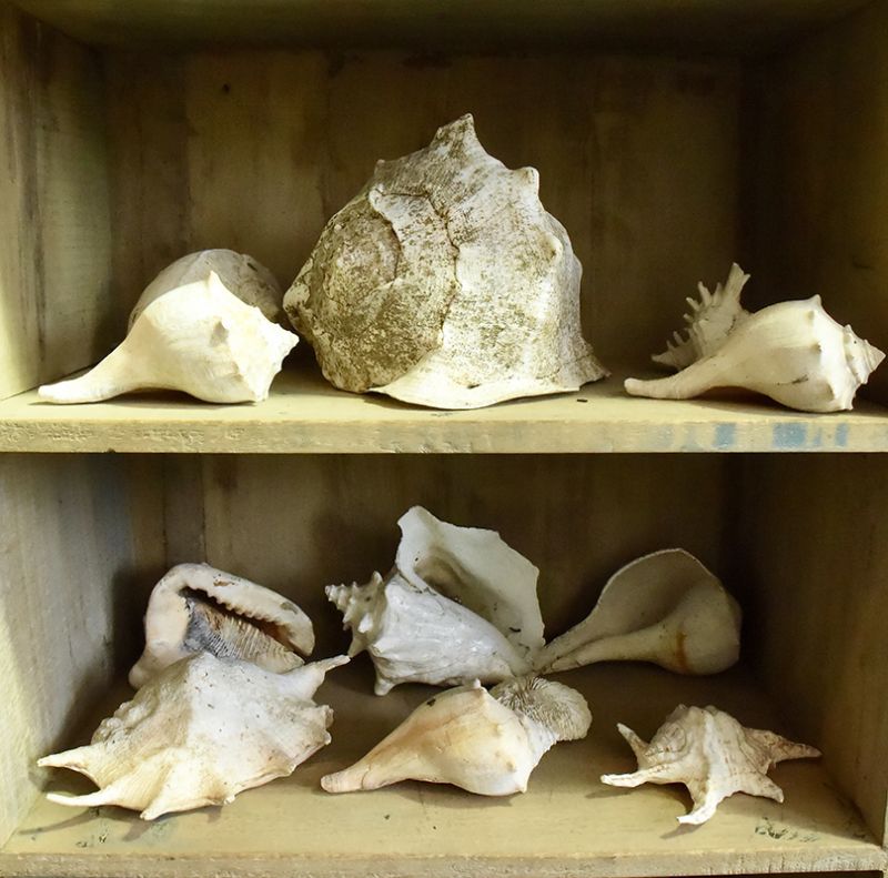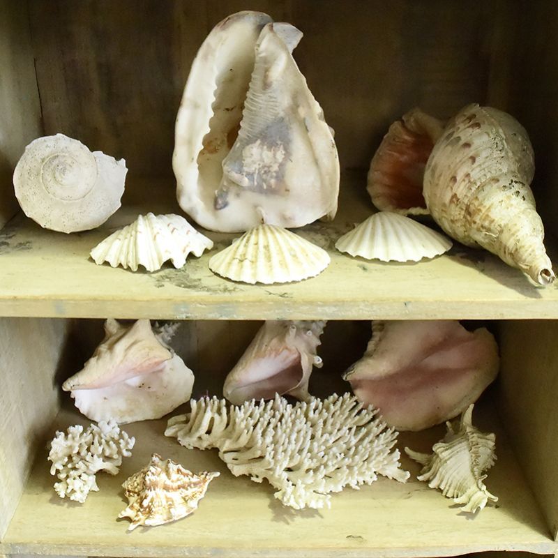A wonderful collection of shells of varying sizes and types. Among them you will find horse and queen conch, small cowrie shells, as well as two pieces of white coral.