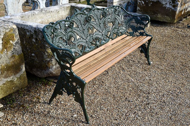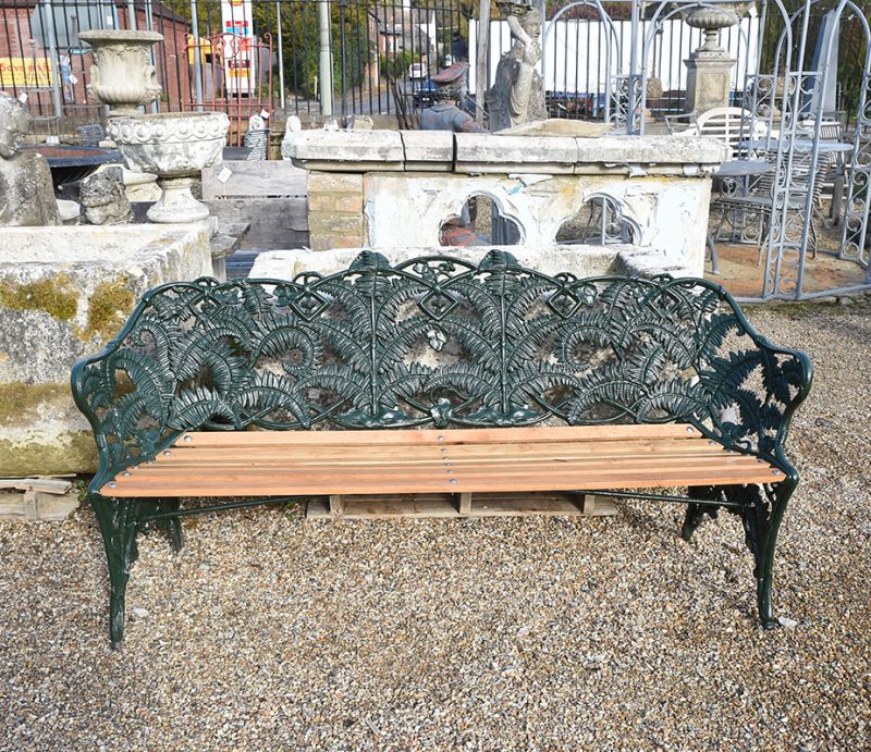 Newly restored and freshly painted in British Racing Green an original Coalbrookdale Foundry garden bench. A wonderful collector's piece. Fern and Blackberry design in cast iron.
