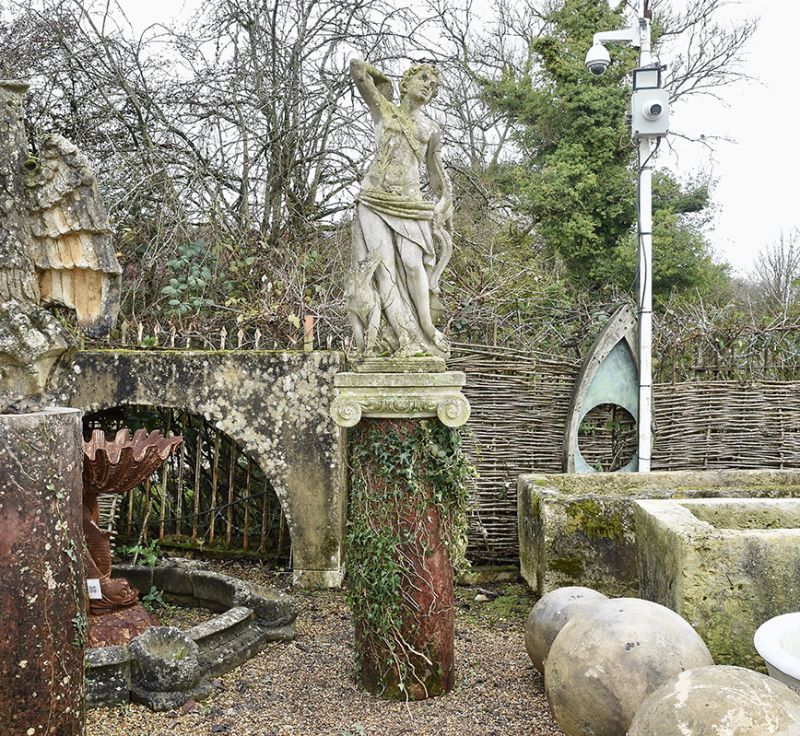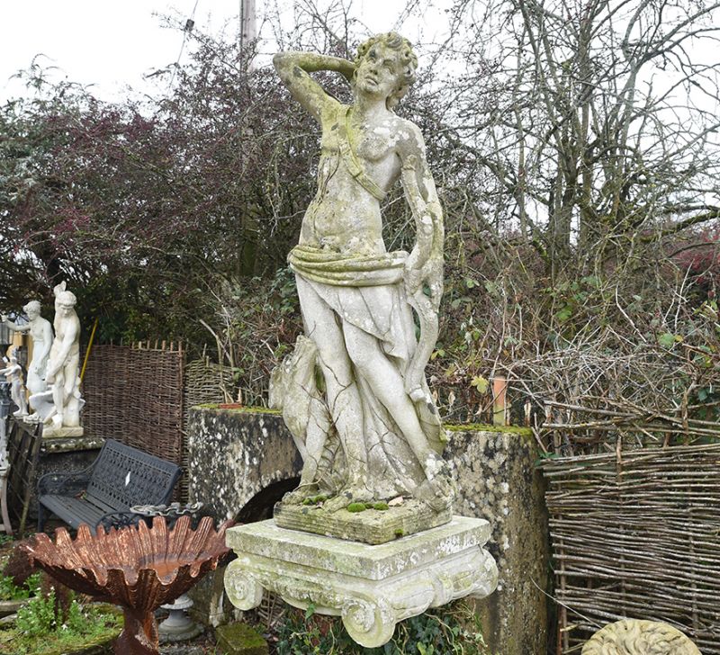 A magnificent statue of Apollo with his bow, quiver of arrows and loyal hound carved from Vincenza Limestone upon an ionic capitol.