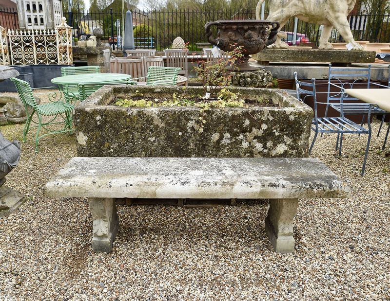 Wonderfully weathered, 19th century stone bench with a substantial Portland stone seat on carved marble supports that are beautifully decorated with acanthus leaf on each side.